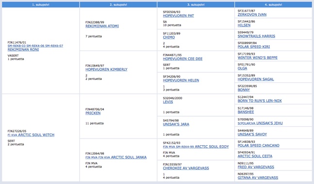 Uhta’s dad is a three-time Finnish champion Rekimiinan Roni. Her mom is Finnish Working Dog Champion Arctic Soul Witch. Please click on the ancestor chat to see the pedigree chart online with much more details. - Klikkaa sukupuuta nähdäksesi sen ja tarkemmat tiedot verkossa.