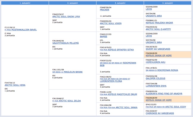Beata has a nice racing background. Her mom Neva (Arctic Soul Hera) is our leader dog, Barak is dog sledding world champion and Zelda is a fine working champion. - Please click on the ancestor chat to see the pedigree chart online with much more details. Beatan sukutaulu on kisajohtajavanhempiensa kautta erinomainen: täynnä Suomen mestareita, käyttövalioita ja muotovalioita. Mm. Maglelin Barak, rekikoirailun maailmanmestari. - Klikkaa sukupuuta nähdäksesi sen verkossa.
