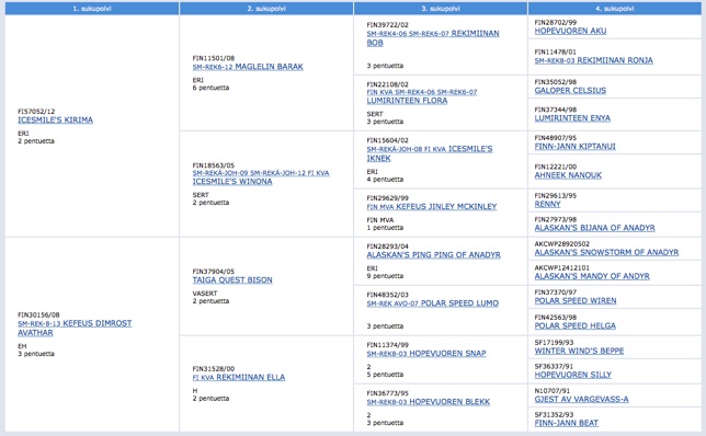Ruska’s parents are our leader dogs Kiri and Ava, who have a tremendous dog sled racing and working champion (KVA) background. - Please click on the ancestor chat to see the pedigree chart online with much more details. Ruskan sukutaulu on kisajohtajavanhempiensa kautta hieno: täynnä Suomen mestareita, käyttövalioita ja muotovalioita. - Klikkaa nähdäksesi sukupuun online verkossa.