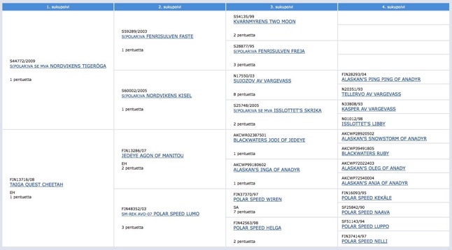 In the pedigree of Kasakan Jack Sparrow ‘Nappi’, the finest lines of Swedish, Finnish and American Long Distance Sled Dog racing unite: Father Nordvikens Tigeröga (World champion 2015), Fenrisulven Faste and Nordvikens Kisel (2006-2009 Amundsen Race 480km, PD300km, FL600km, FL400km ...), mother Taiga Quest Cheetah (Finnish Long Distance races, 2010-2011 Pasvik Trail 280km), Blackwater’s Jodi of Jedey & Alaskan’s Inga of Anadyr (Yukon Quest, Iditarod), Finnish champion Polar Speed Lumo). - Please click the pedigree to see the online -version of it.