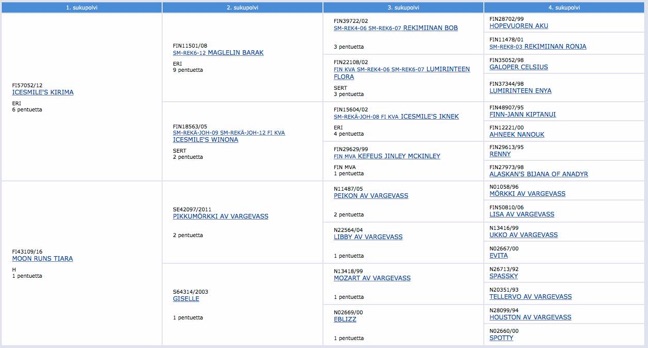In the pedigree of Vetoava Elegia, the finest lines Finnish and Swedish/Norwegian working dog lines unite: Father Kiri is with his World Champion father (Barak) and Finnish Championship mother (Winona) one of our best dogs. Tiara comes from Vargevass background, full of long distance leaders. - Please click the pedigree to see the online -version of it.