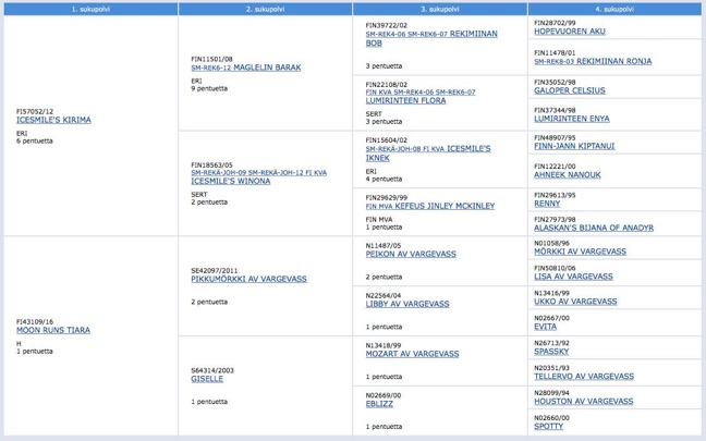 In the pedigree of Vetoava Energiija ‘Mette’, the finest lines Finnish and Swedish/Norwegian working dog lines unite: Father Kiri is with his World Champion father (Barak) and Finnish Championship mother (Winona) one of our best dogs. Tiara comes from Vargevass background, full of long distance leaders. - Please click the pedigree to see the online -version of it.