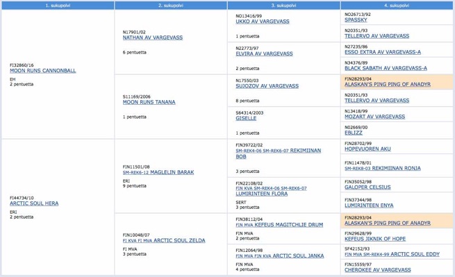 From his father’s side, Gamot is fully descendant from famous Vargevas-line. Her granddad is Nathan av Vargevassa, the famous Vargevass leader. She has several Finnish Champion and World Champion ancestors from her mother Beata’s side. - Please click the ancestor chart to see this online. - Klikkaa sukupuuta nähdäksesi Gamotin sukupuun online