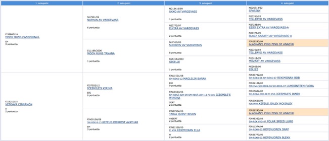 Irgad’s dad is our long distance racer Cannon, whose dad is one of the most famous Kennel Vargevass leaders, Nathan av Vargevass. His mother Sinna is our strong leader dog, whose parents Kiri and Ava are fine racers. - Please click the ancestor chart to see the pedigree and the dog’s uptodate info online. - Klikkaa kuvaa nähdäksesi sukupuun online.