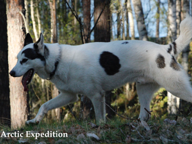 Irgad is definitely our strongest and biggest male and that is why we most often trust him as our hardworking wheel dog. He keeps the line tight all the time and just wants to pull. Irgad has a strong character and does not want to be left as the bottommost dog in the pact hierarchy. He behaves nicely with everybody, humans or dogs and has a big, lovable, often licking big tongue:)