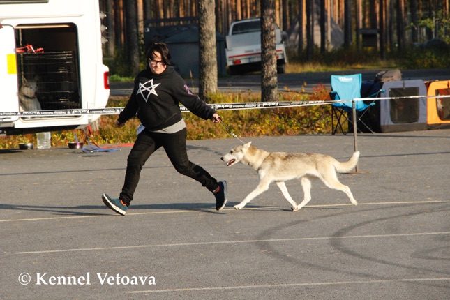 Nonna posing in the Finnish Siberian Husky Speciality Show 2020, Seinäjoki, Finland. - She received EH (VERY GOOD) - qualification in junior class.
